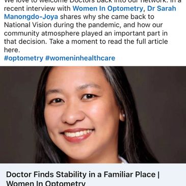 02/08/2021 National Vision Inc.(17,538 followers) We love to welcome Doctors back into our network. In a recent interview with Women In Optometry, Dr Sarah Manongdo-Joya shares why she came back to National Vision during the pandemic, and how our community atmosphere played an important part in that decision. Take a moment to read the full article here.